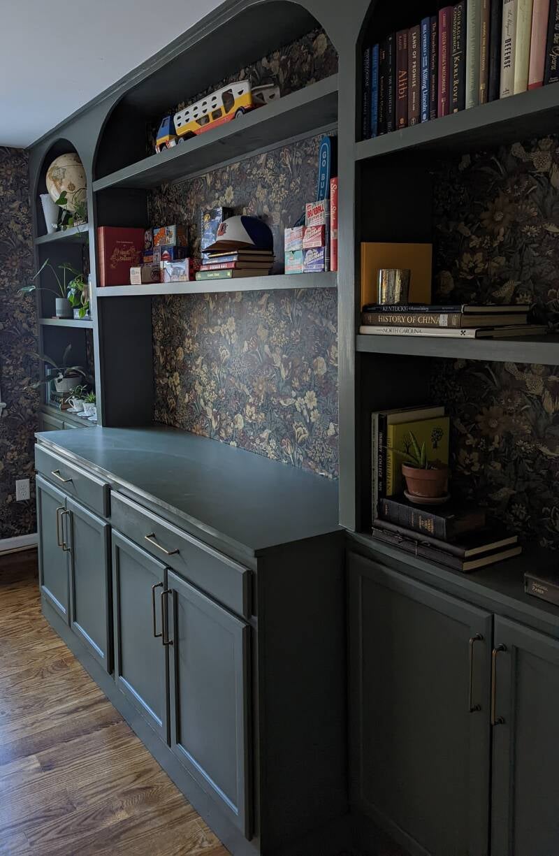 I was honestly worried the wallpaper was going to be too busy but I think after styling the shelves a bit it looks amazing! I loved the wallpaper so much I did the side wall in the office as well!