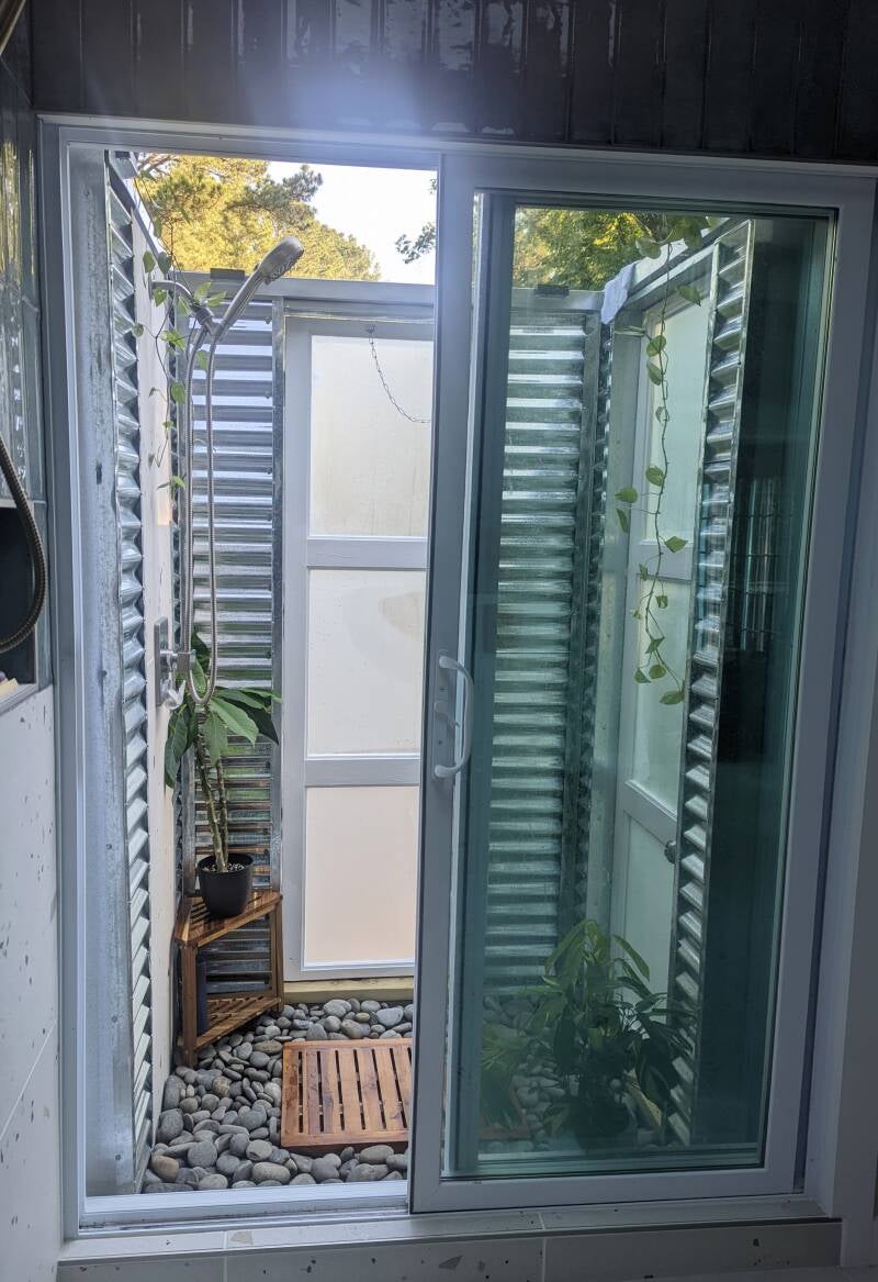 This design allows us to shower outside and step right into our bathroom without having to run through the yard in our towel 😆 Honestly, we use the outside shower more than the inside shower, especially in the summer!