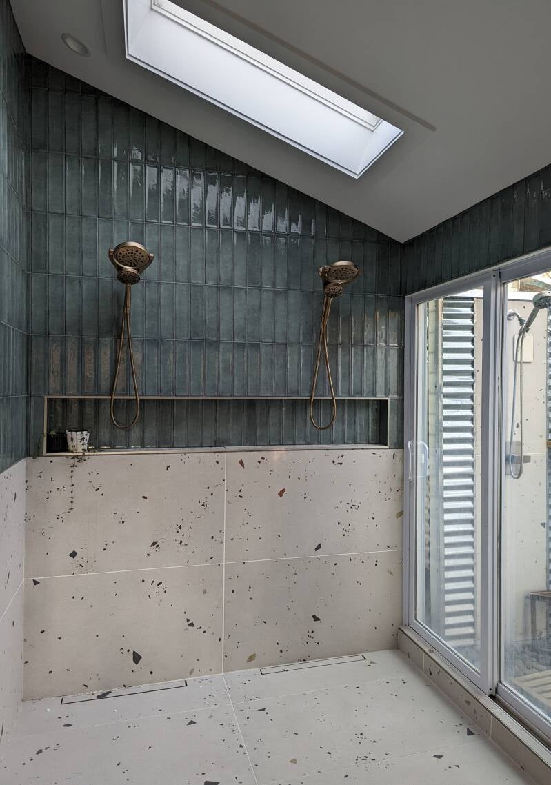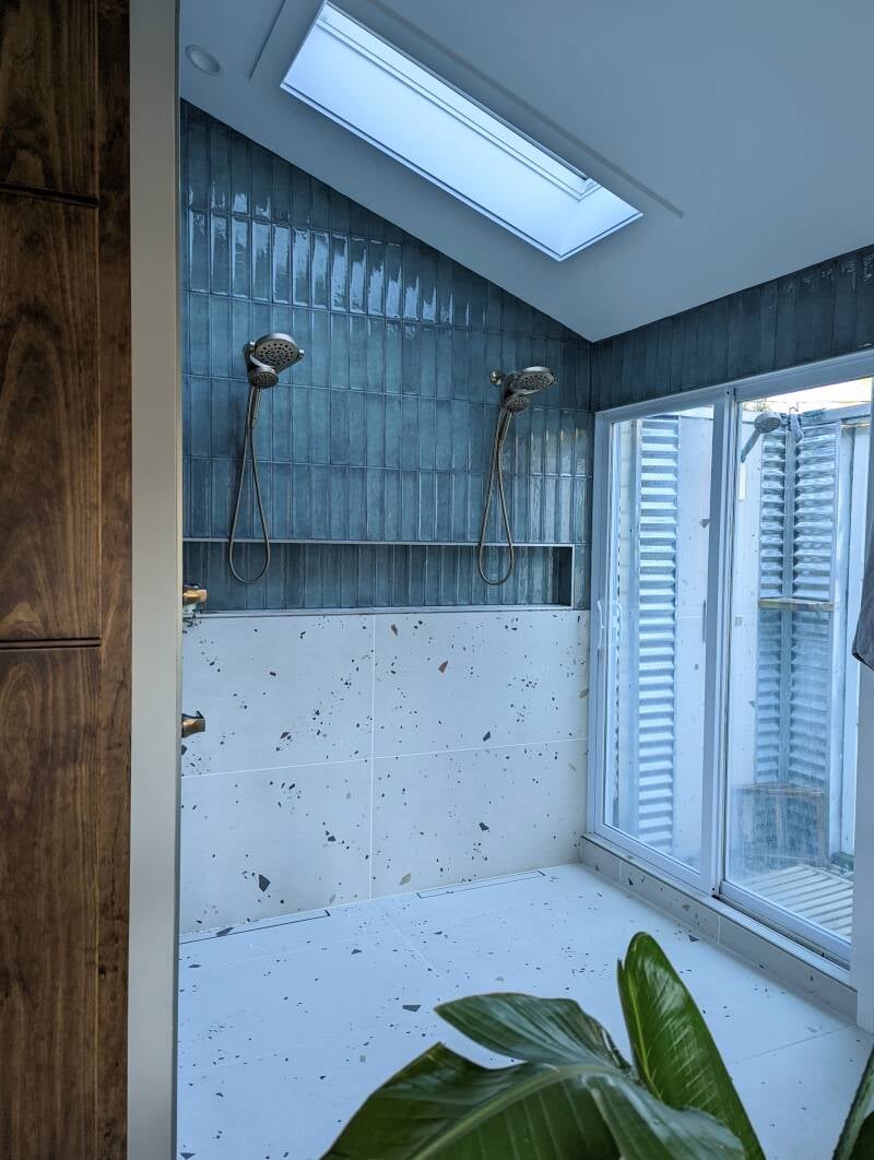 This shower is officially my favorite place in the house. I love the openness of the space with the vaulted ceiling and skylight. The two tiled drains and curbless design flows seamlessly into the rest of the bathroom. The most amazing feature is the connection to the outdoor shower.
